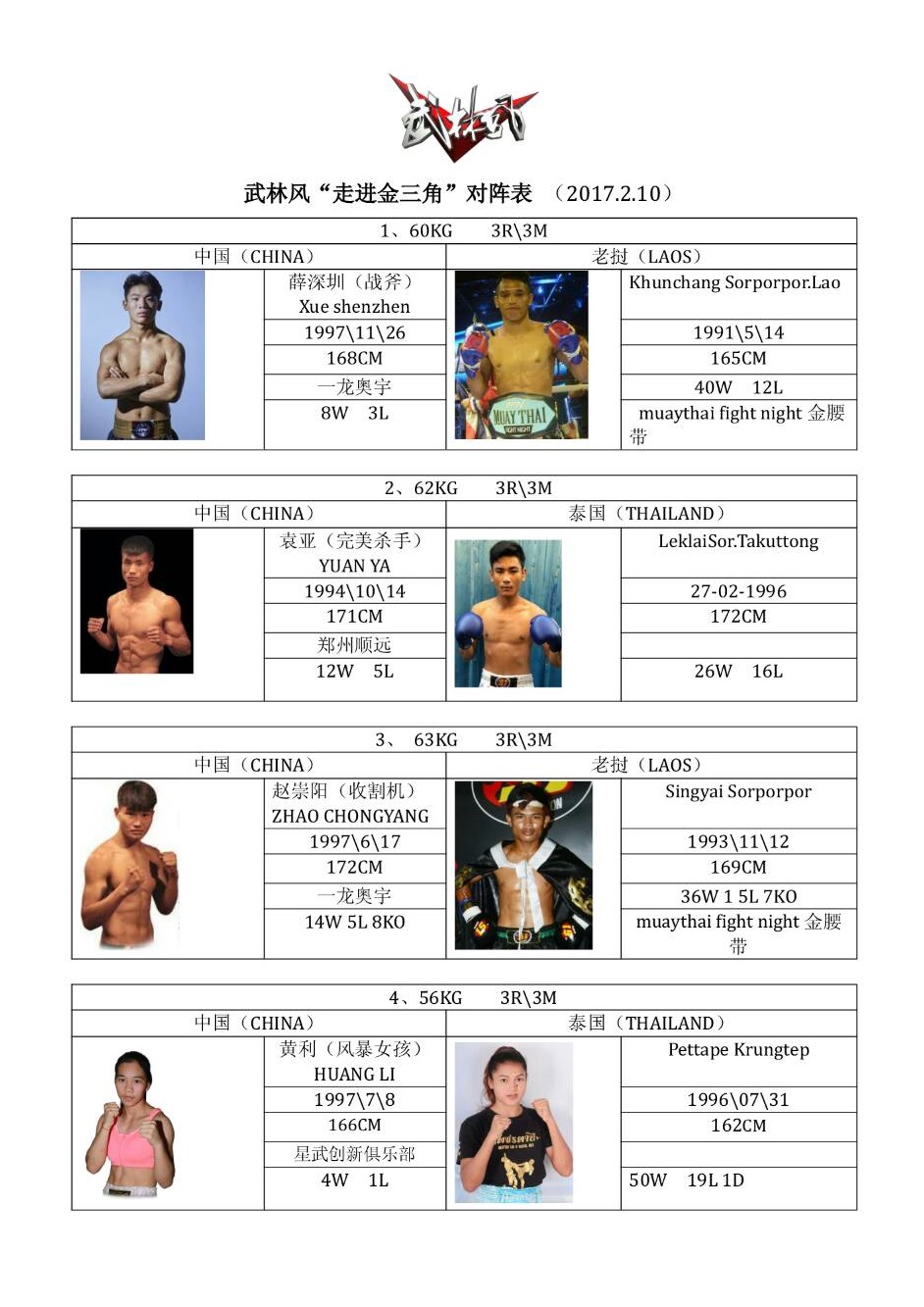 It is another big program for golden triangle Indochina,at King Roman Laos to have great event Muaythai boxers international VS WFL Chinese on February 10th . The fight program will be Senjen VS Kunchang SorporporLao, Yuan ya VS Thai boxer Leklai Sor Takrudtong, Chao Chongyang VS Singyai SorporporLao, Petchtapee VS Wang Li, Cheng Wendy Po VS Yodvicha TanakornGym, Wang Jun Yu VS Petpikat Kor Kunbut, Jin Ying meets Tong Makara from Cambodia, Song Chaogil VS James Heren, Chong Chijiang VS Chaman Kengkaj, Chi li VS Kalo Matias from France. Team travel out of Thailand tomorrow leading by Madame Oh Pariyakorn Ratanasuban.