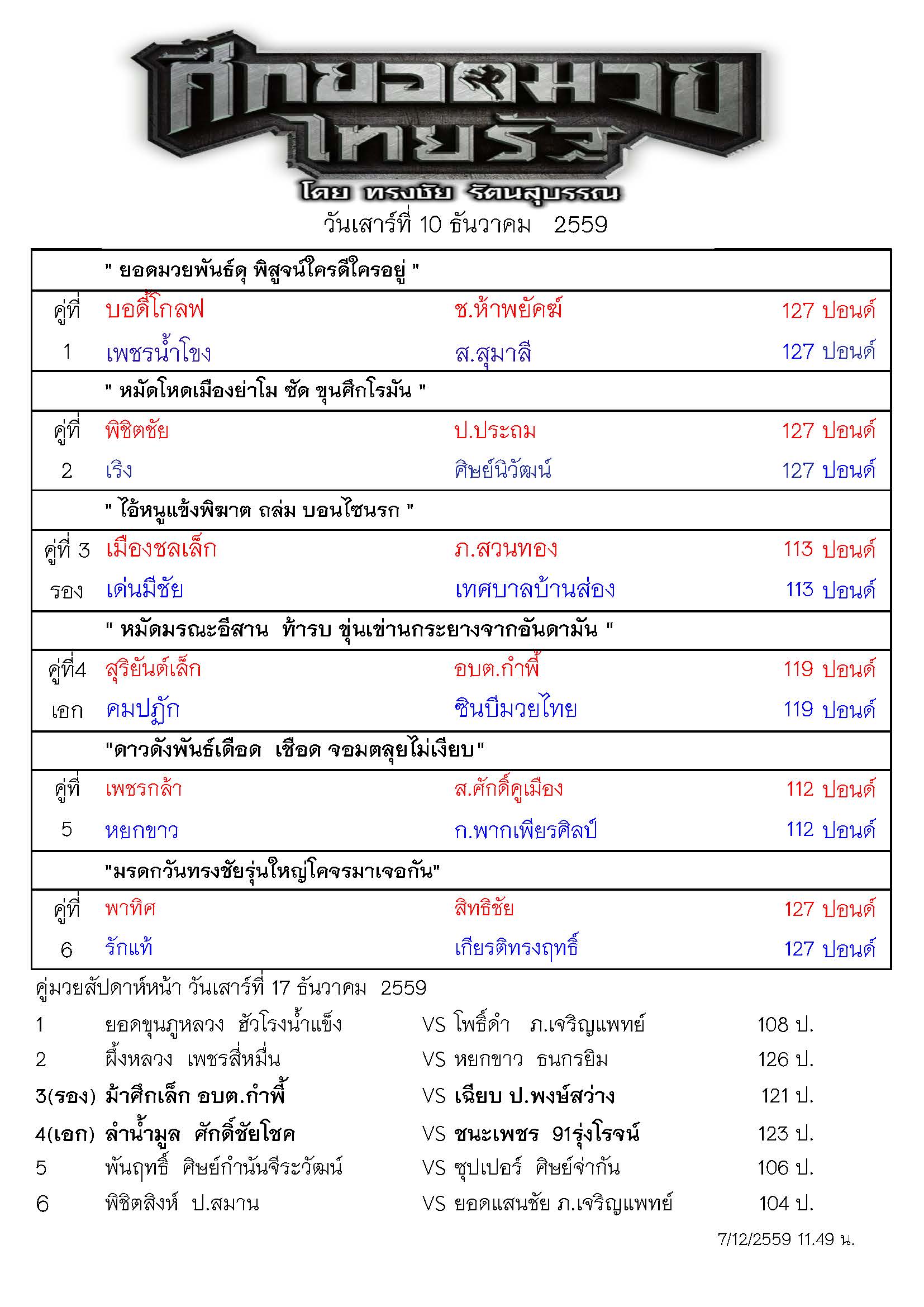 Home ข่าววันทรงชัย ศึกยอดมวยไทยรัฐ โดยทรงชัย รัตนสุบรรณ เสาร์ที่ 10 ธันวาคม 2559 ข่าววันทรงชัยโปรแกรมการแข่งขัน ศึกยอดมวยไทยรัฐ โดยทรงชัย รัตนสุบรรณ เสาร์ที่ 10 ธันวาคม 2559 By admin - December 8, 2016 276 Facebook Twitter Pinterest WhatsApp