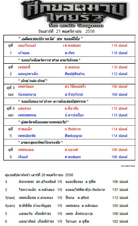 Home ข่าววันทรงชัย ศึกยอดมวยไทยรัฐ วันเสาร์ที่ 21 พฤศจิกายน 58 โดยทรงชัย รัตนสุบรรณ ข่าววันทรงชัยโปรแกรมการแข่งขัน ศึกยอดมวยไทยรัฐ วันเสาร์ที่ 21 พฤศจิกายน 58 โดยทรงชัย รัตนสุบรรณ By admin - November 13, 2015 2005 Facebook Twitter Pinterest WhatsApp