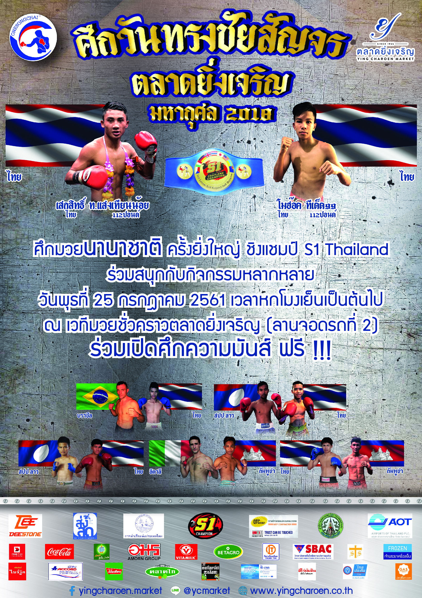 ศึกวันทรงชัย ตลาดยิ่งเจริญ มหากุศล 2018 ศึกมวยนานาชาติครั้งยิ่งใหญ่ ชิงแชมป์ S1 Thailand ร่วมสนุกกับกิจกรรมหลากหลาย วันพุธที่ 25 กรกฎาคม 2561 เวลาหกโมงเย็นเป็นต้นไป ณ เวทีมวยชั่วคราวตลาดยิ่งเจริญ (ลานจอดรถที่ 2) ร่วมเปิิดศึกความมันส์ ฟรี!!!