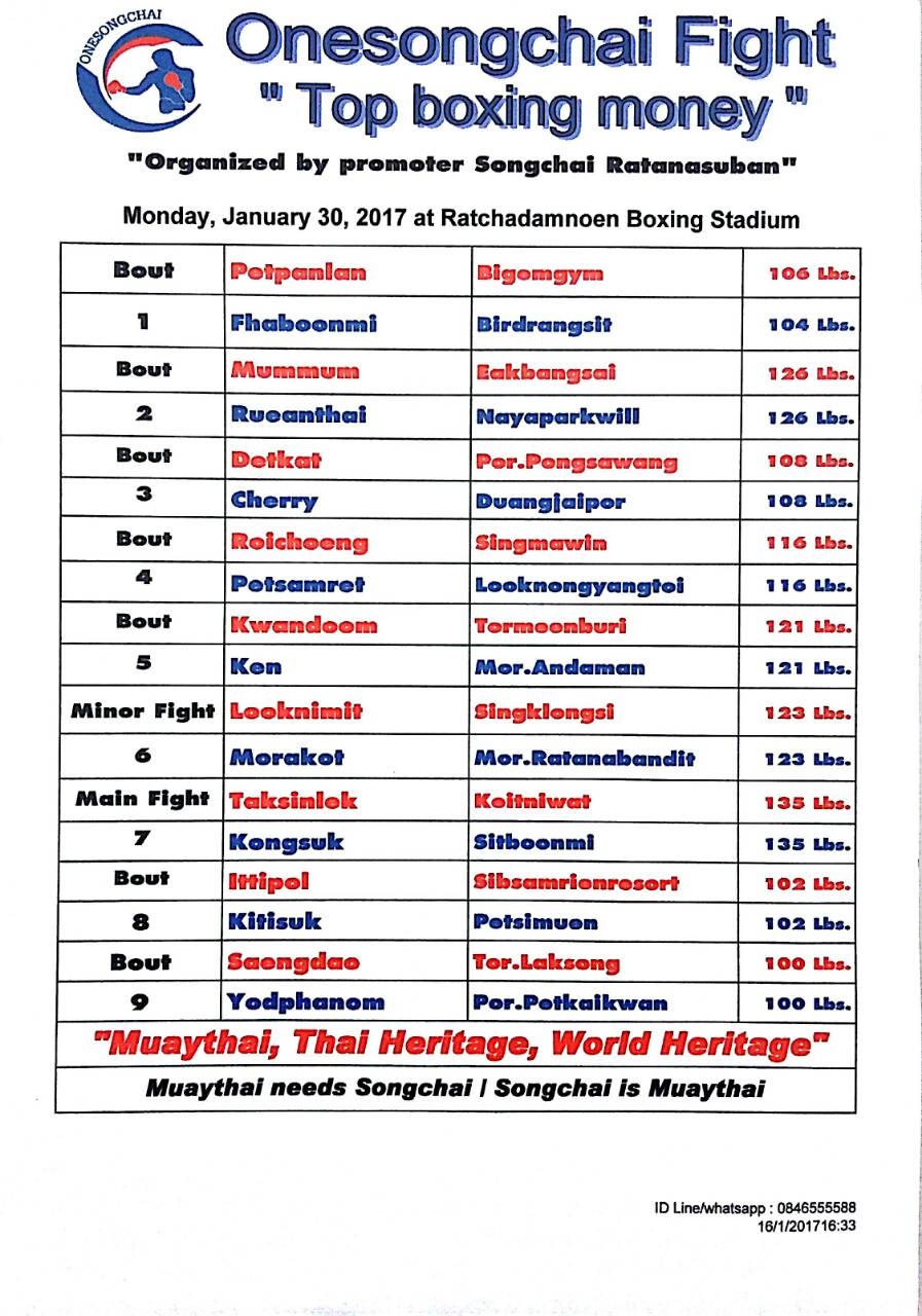 Home News ONESONGCHAI FIGHT “TOP BOXING MONEY” MONDAY , JANUARY 30, 2017 NewsPrograms ONESONGCHAI FIGHT “TOP BOXING MONEY” MONDAY , JANUARY 30, 2017 By admin - January 17, 2017 1090 0 Facebook Twitter Pinterest WhatsApp