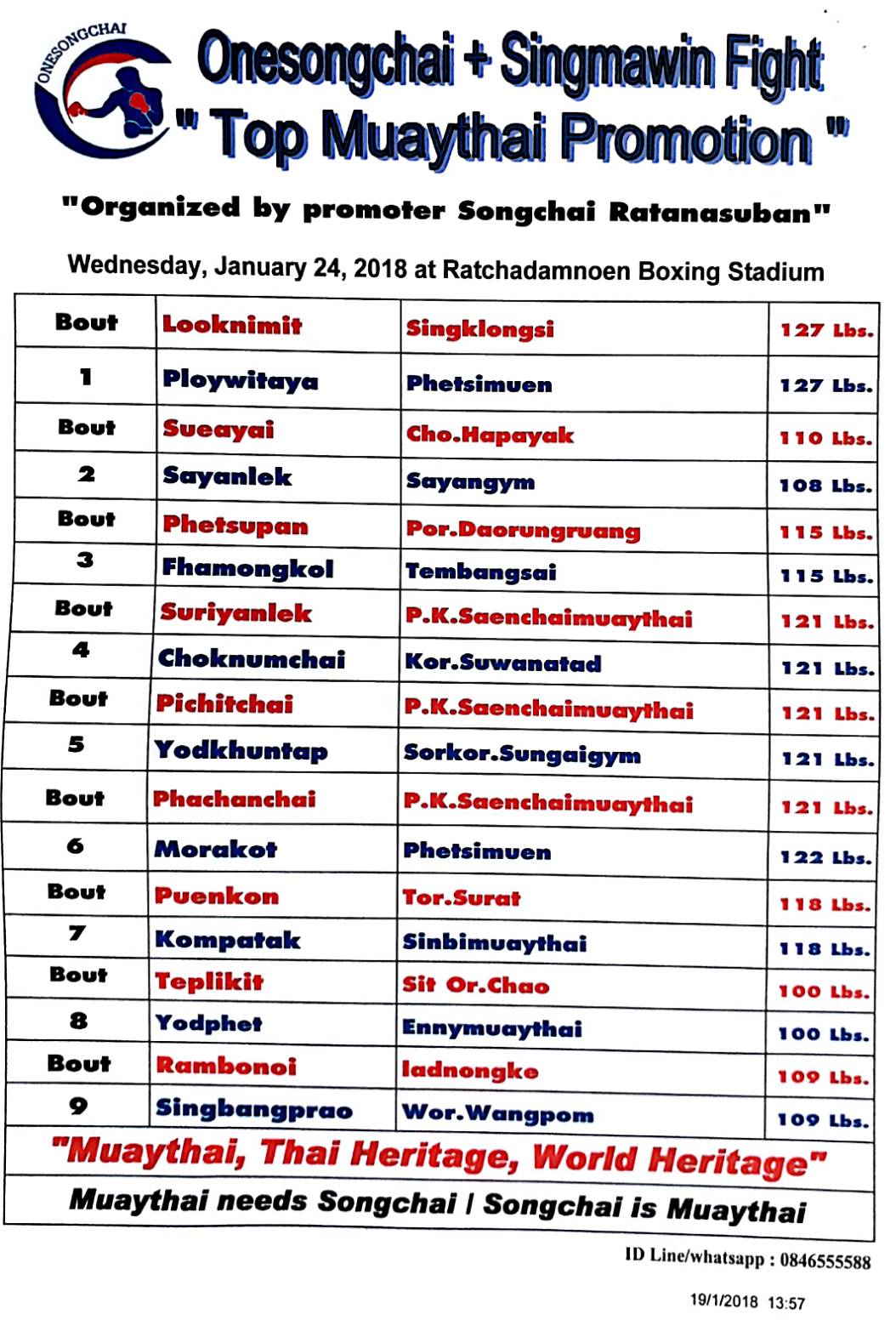 Home Programs Boxing Program “Onesongchai+Singmawin Fight. January 24, 2018 at Ratchadamnoen Boxing Stadium ProgramsBoxing ProgramNews “Onesongchai+Singmawin Fight. January 24, 2018 at Ratchadamnoen Boxing Stadium By admin - January 19, 2018 972 0 Facebook Twitter Pinterest WhatsApp